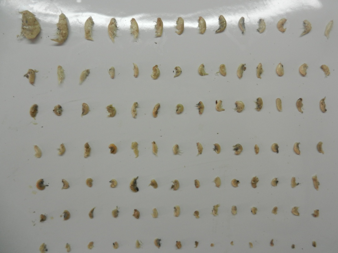 此外,最近,中國科考團隊在馬里亞納海溝約7,400米處也誘捕到若干尾深海獅子魚(圖4)。通過解剖,還在這些獅子魚胃含物中發現大量形態較為完整的甲殼類生物(圖5),這也表明超深淵區域并非如人們想象中生物資源匱乏。