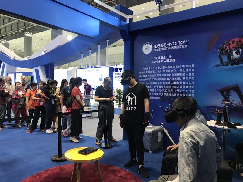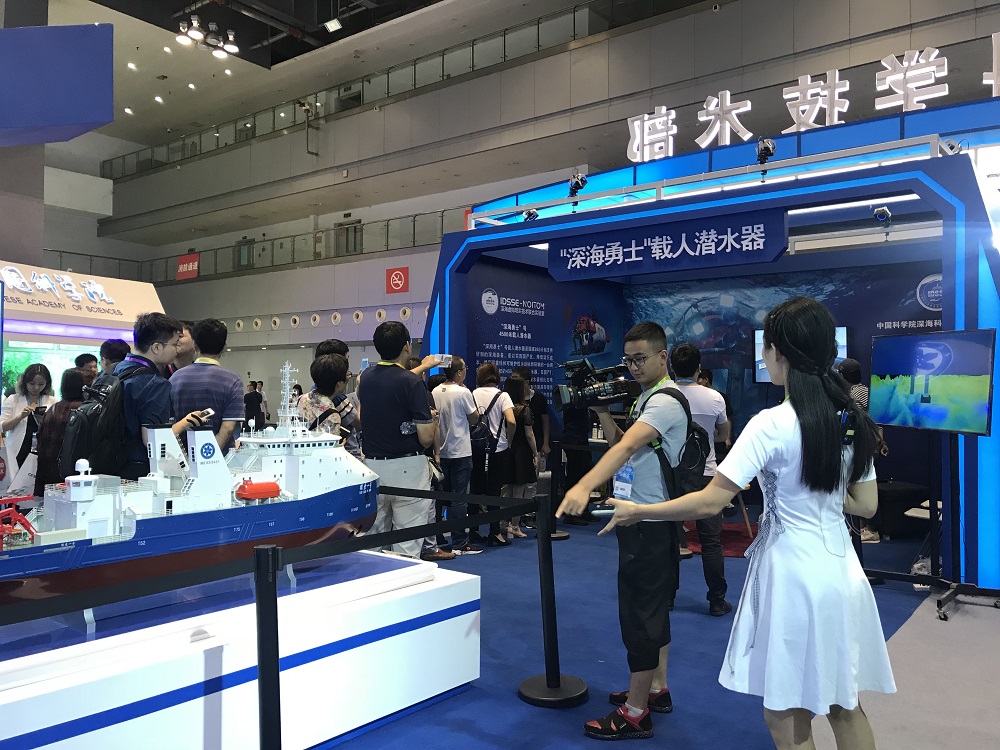 為深入貫徹軍民融合發(fā)展戰(zhàn)略,促進(jìn)軍民融合產(chǎn)業(yè)創(chuàng)新發(fā)展,中國(guó)科學(xué)院深海科學(xué)與工程研究所應(yīng)科學(xué)技術(shù)部的邀請(qǐng),參加此次展會(huì)。深海所展出了“探索一號(hào)”科考船及其搭載的深海儀器設(shè)備模型,以視頻形式向大眾展示了中科院深淵科考隊(duì)“探索一號(hào)”到馬里亞納海溝挑戰(zhàn)者深淵開(kāi)展深淵科考的情況。并利用虛擬現(xiàn)實(shí)技術(shù)(VR)多維解析了我國(guó)擁有自主知識(shí)產(chǎn)權(quán)的載人潛水器“深海勇士”號(hào)的結(jié)構(gòu)原理,通過(guò)VR場(chǎng)景模擬讓觀眾親身體驗(yàn)乘坐“深海勇士”號(hào)潛入深海進(jìn)行科考作業(yè)的場(chǎng)景。