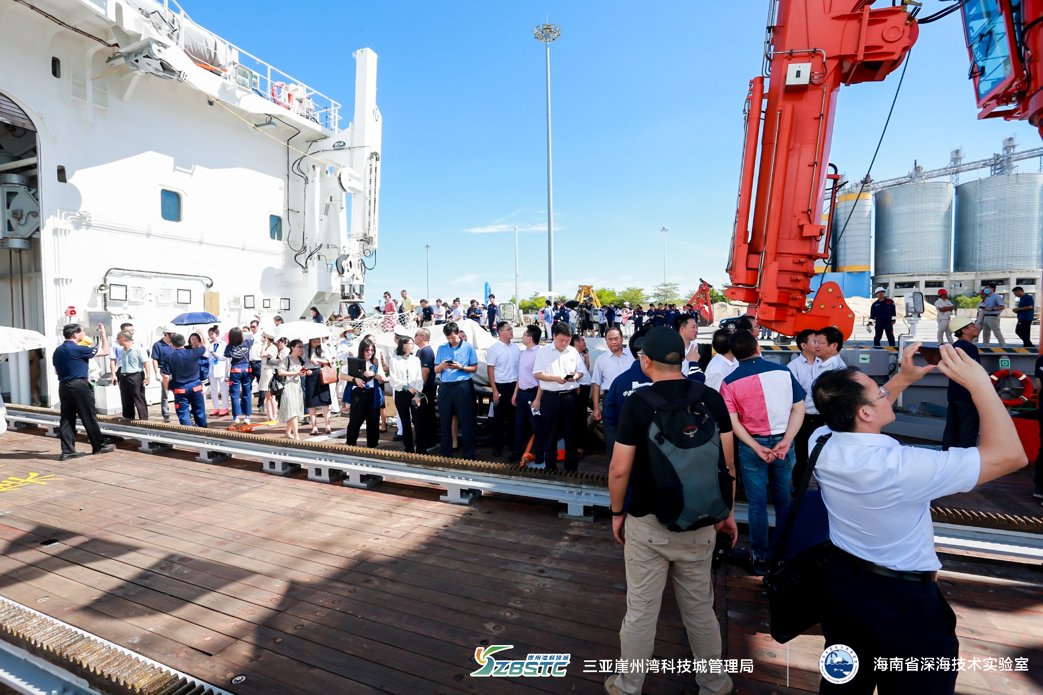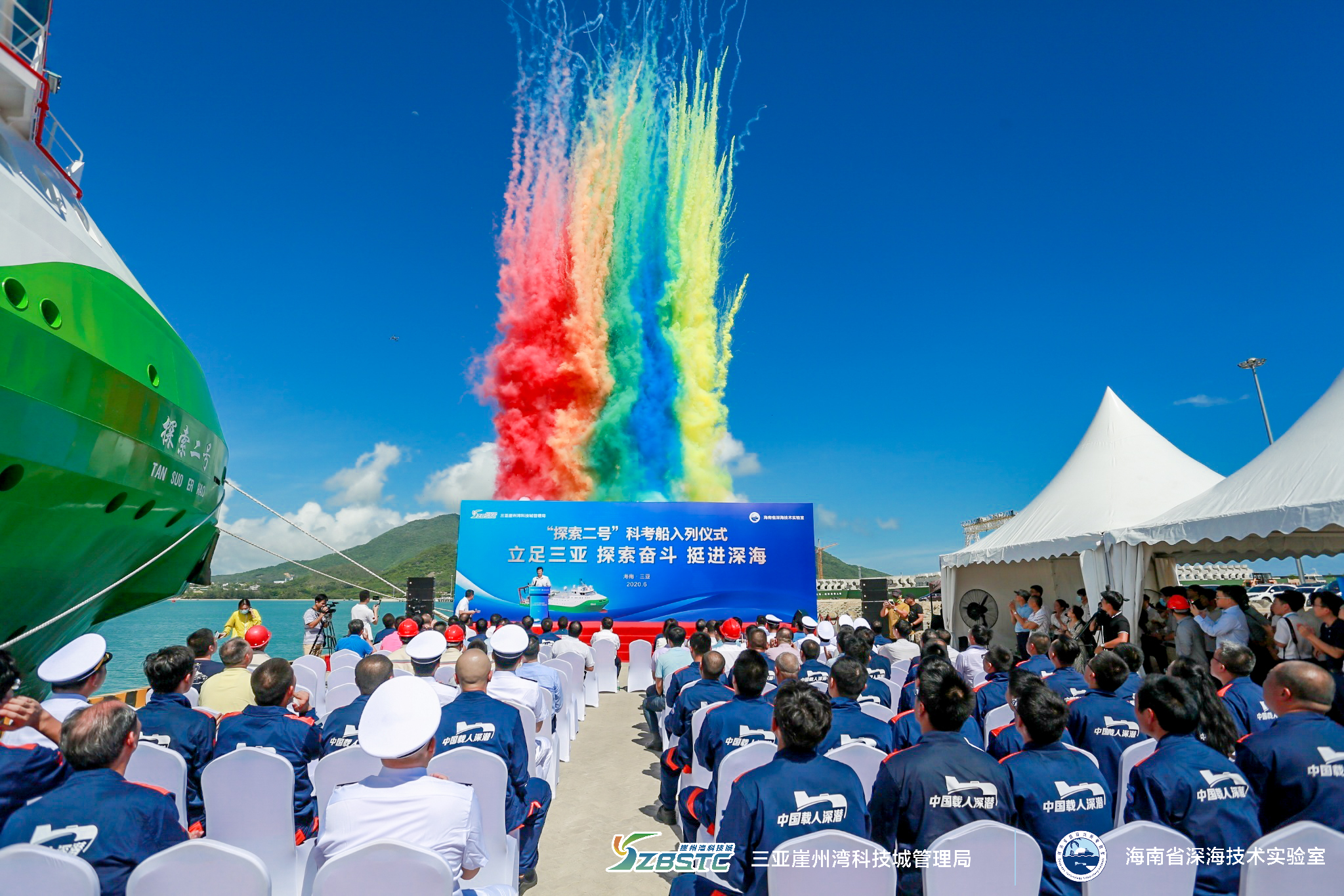 625, “探索二號”船從福建馬尾造船廠碼頭啟航,經過830海里的航程, 28日下午,順利抵達三亞崖州灣科技城南山港碼頭。來自海南省人民政府、海南省科學技術廳、深圳市規劃和自然資源局、中國船舶集團702研究所、704研究所、武漢理工大學、中科院沈陽自動化所、中科院聲學研究所、三亞崖州灣科技城管理局等相關單位代表共200余人參加接船儀式。