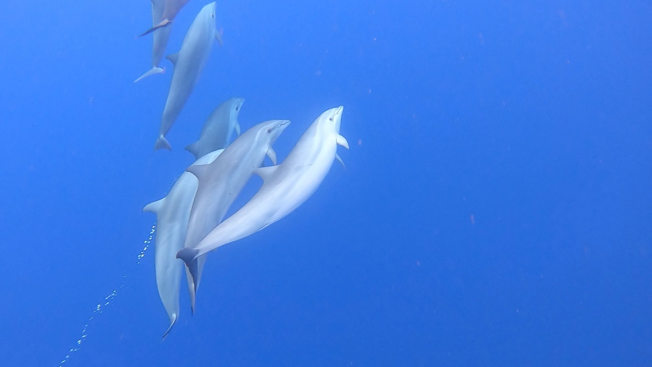 該航次歷時21天,航程3000多公里,考察區(qū)域集中在南海北部西沙群島和中沙群島的陸坡、海山及海槽水域。航次采用目視考察和被動聲學(xué)監(jiān)測相結(jié)合的方法,并輔以環(huán)境DNA收集,旨在“2019年南海深潛及遠海鯨類科考” 航次的基礎(chǔ)上,進一步對考察海域的鯨類物種多樣性、種群現(xiàn)狀及分布模式等進行較為全面的調(diào)查。考察期間,共目擊到深潛和遠海鯨類動物31群次,其中深潛鯨類14群次。通過視頻和照相拍攝、動物水下發(fā)聲記錄,獲取了大量的南海鯨類圖片、視頻和音頻等資料。