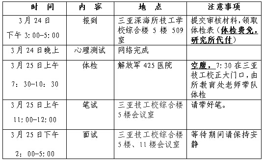 中科院深海科學(xué)與工程研究所2016年招收碩士研究生復(fù)試工作定于2016年3月25日在三亞進(jìn)行。具體內(nèi)容如下: