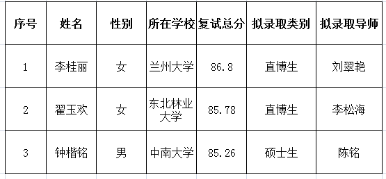 根據教育部、中國科學院大學相關文件精神,本著“公平公正、全面衡量、保證質量、寧缺毋濫”的原則,通過對考生面試、政審以及體檢等綜合考核,經深海所招生工作領導小組審核批準,李桂麗、翟玉歡2位同學根據本人申請并通過考核,被擬錄取為深海所推薦免試直博生、鐘楷銘同學被擬錄取為深海所推薦免試碩士研究生?,F將擬錄取名單予以公示,公示期十個工作日。