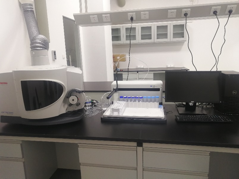 ICP-OES 7400位于綜合樓一樓101實(shí)驗(yàn)室,該儀器配置了標(biāo)準(zhǔn)進(jìn)樣系統(tǒng)、垂直高鹽進(jìn)樣系統(tǒng)及垂直耐HF進(jìn)樣系統(tǒng);具有快速多元素同時(shí)分析、靈敏度高、檢出限低、耐基質(zhì)、線性動(dòng)態(tài)范圍寬等優(yōu)點(diǎn)。可用于生物、地質(zhì)、材料、食品、環(huán)境等各類樣品中大多數(shù)元素的定量分析。