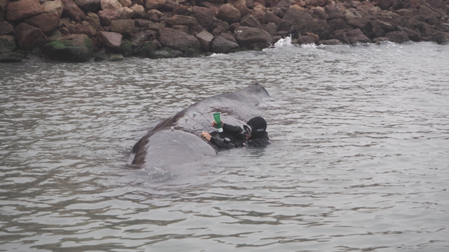 該抹香鯨最初發現時,其周身被漁網纏繞。當潛水員剪開困住抹香鯨的漁網后,發現在動物口中也有大量的漁網。且不論抹香鯨是否由于人類活動而最終致死,但人類活動始終對其造成了影響。這種大型鯨類一旦發生擱淺事件,救助工作難度極大。大型鯨類擱淺救助成功的案例在世界上還極為少數。希望公眾可以以此為鑒,提高海洋環境、海洋生物的保護意識,同時也希望有關類似事件的應急響應機制能夠盡快建立,以期在類似事件發生后可以在第一時間做出科學應對方案并進行有效救護。