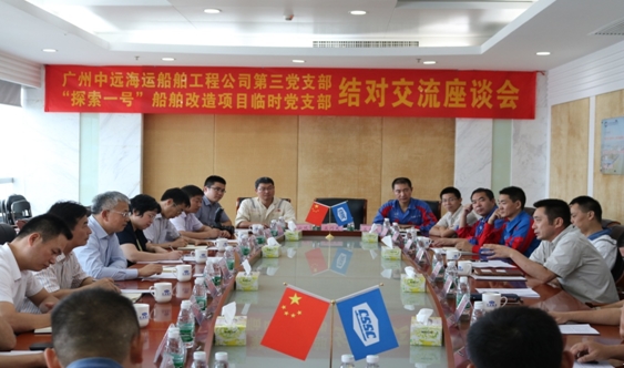 510日下午,中遠海運(廣州)有限公司黨委書記金義松帶領船舶工程公司第三黨支部一行9人與“探索一號”二期改建項目臨時黨支部進行座談交流,參觀了船舶改造現場。