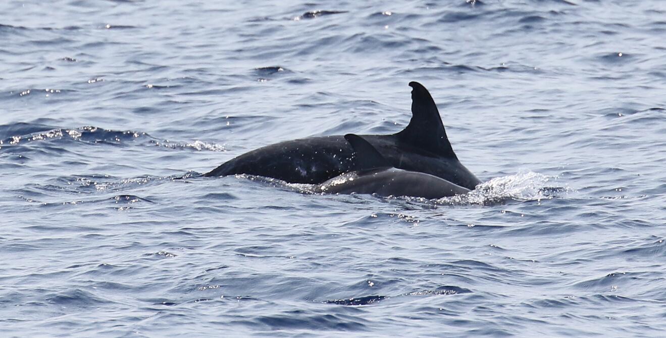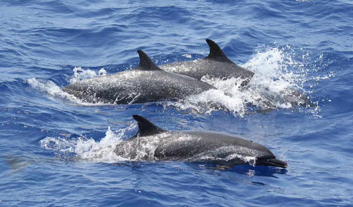 航次采用目視考察手段、截線抽樣方法,在海南島東南海域陸坡區域進行科學考察,以了解該區域深潛和遠海性鯨類物種組成、空間分布和行為特征。考察過程中,科考隊員在南海北部海域發現了大量的鯨類動物,一共目擊到深潛和遠海性鯨類動物27群次,其中可確定的深潛鯨類物種4種,分別為抹香鯨、柯氏喙鯨、短肢領航鯨、花紋鯨(瑞氏海豚);遠海性海豚物種3種,分別為熱帶斑海豚、條紋海豚、弗氏海豚。另有2個物種還有待進一步確定。考察結果顯示,考察海域目前擁有較高的深潛和遠海性鯨類物種多樣性;除熱帶斑海豚外,其它動物群體均是科研人員在考察海域的首次發現和記錄;其中,抹香鯨和喙鯨群體都觀察到母子對,表明南海北部考察海域極有可能存在抹香鯨和喙鯨的定居群體。這些發現填補了南海鯨類尤其是南海深潛鯨類研究的空白。
