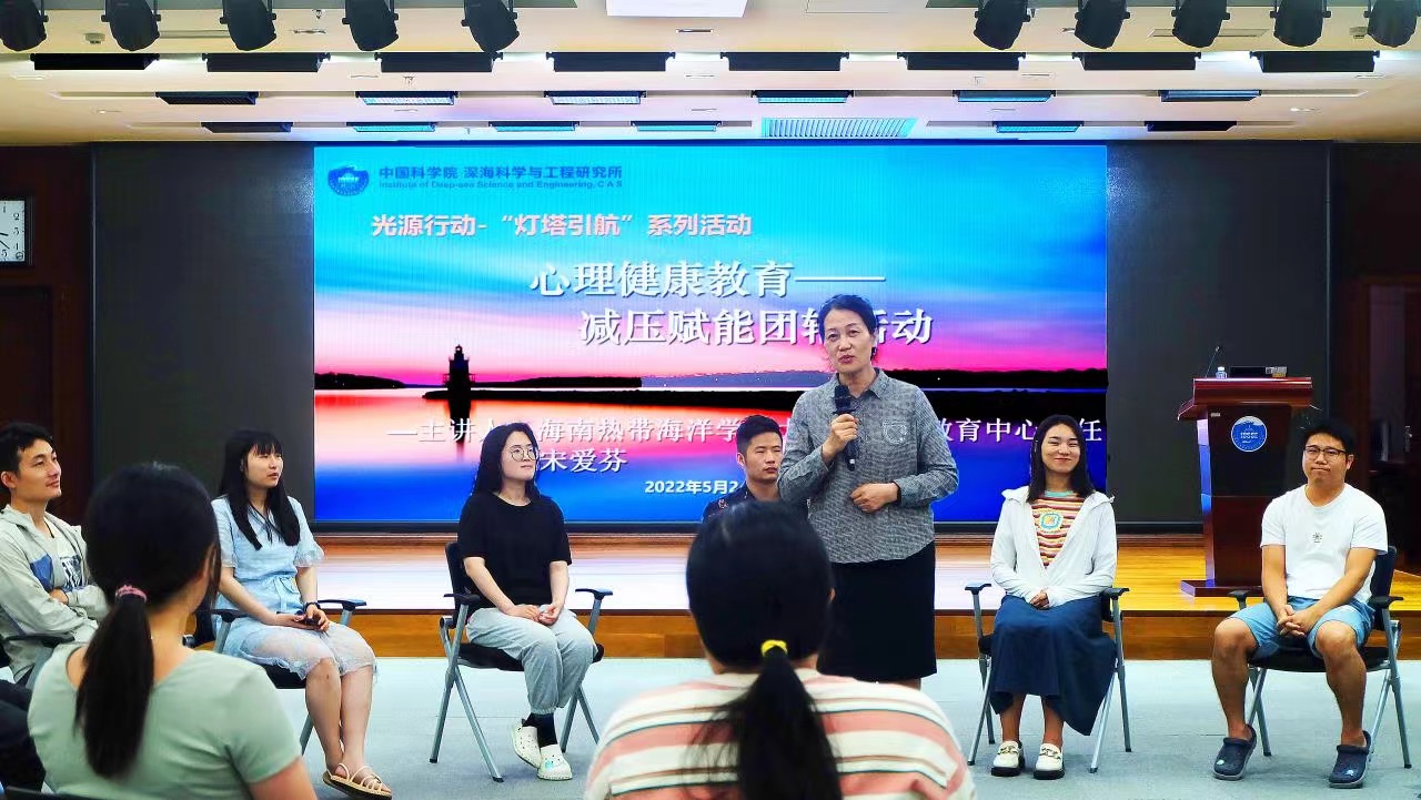 5月24日下午 ,光源行動——“燈塔引航”系列沙龍活動第九講在深海所綜合樓1003會議室舉辦。此次活動的主題是:研究生心理關(guān)愛活動--減壓賦能團輔活動,由海南省拔尖人才、海南熱帶海洋學(xué)院大學(xué)生心理教育中心主任、海南省心理咨詢行業(yè)協(xié)會副會長宋愛芬教授主講。此次活動以游戲與集體活動的形式開展。
