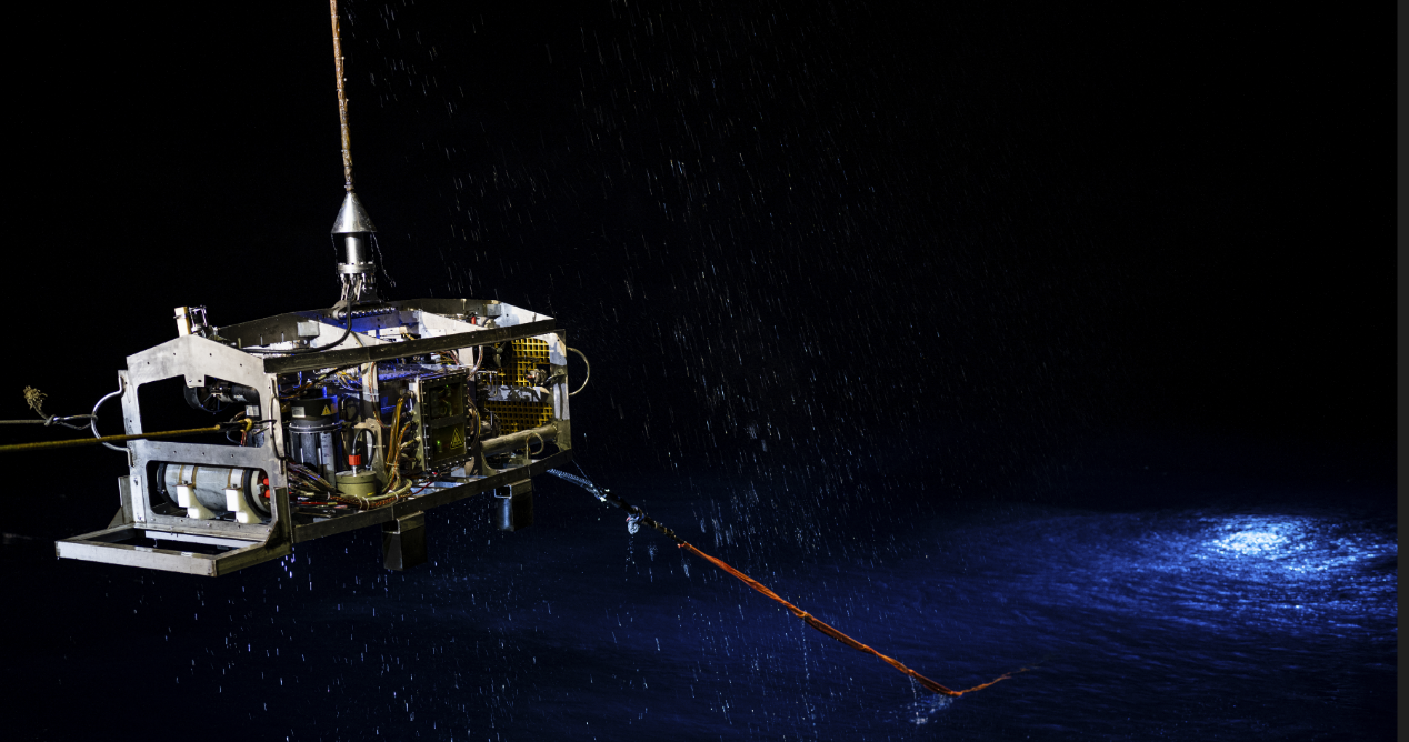 在本航次中,“探索二號”船通過光電復合鎧裝纜連接至中繼器,再通過非金屬輕質(zhì)光電復合臍帶纜連接至ROV。中繼器與ROV組成柔性連接的分體式系統(tǒng),該系統(tǒng)進行了4500米級海上試驗應用,有效驗證了“中繼器-ROV”的分體式布放-回收方案及測試流程,以及ROV各分系統(tǒng)及模塊的設計性能指標,并充分測試了ROV在4500m級大工作深度下的綜合作業(yè)能力,如定高、定深、定向、定速、樣品抓取收集等。