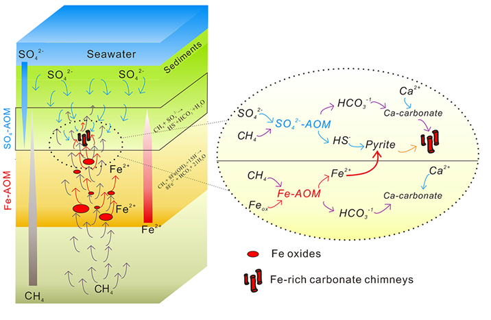 甲烷厭氧氧化作用(AOM)是海洋中的一個重要的生物地球化學過程,消耗了海洋沉積物中絕大多數的甲烷,并影響著海底碳酸鹽沉積體的形成。除了硫酸根和硝酸根等能作為電子受體以外,三價鐵(Fe3+)也可以作為潛在的電子受體,驅動與鐵還原耦合的甲烷厭氧氧化作用(Fe-driven AOM)。盡管已有少量實驗室培養證據顯示,Fe-driven AOM可能發生于自然界高甲烷沉積環境之中,但Fe-driven AOM 發生的地質化石記錄從未被報道過。因而,學術界并不清楚這一過程對海洋沉積物中實際甲烷消耗(氧化)的重要程度。