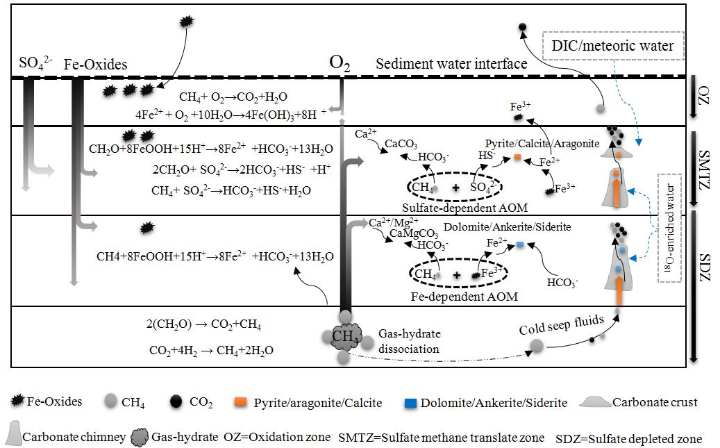 圖1 沖繩海槽沉積柱體不同氧化還原帶中甲烷循環和冷泉碳酸鹽礦物沉淀模式圖