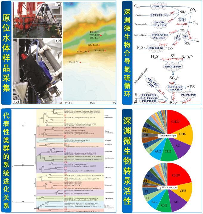 基于新的基因組分析技術,研究人員成功獲取了30個深淵微生物類群的高質量基因組序列,闡明了與氮硫相關的元素循環過程和轉錄活性特征,并重點闡釋了Chloroflexi和Marinimicrobia分別在深淵難降解型有機物和蛋白類有機物的代謝方面所發揮的重要作用。