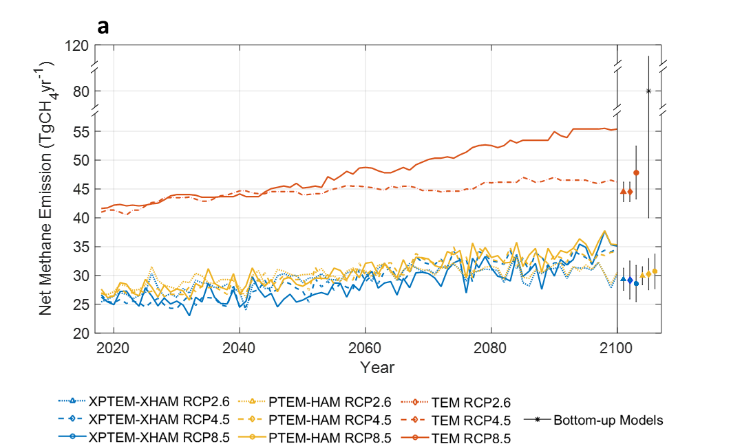 從2017年到2100年北極(北緯50°以上)年度凈甲烷排放量預(yù)測(cè)