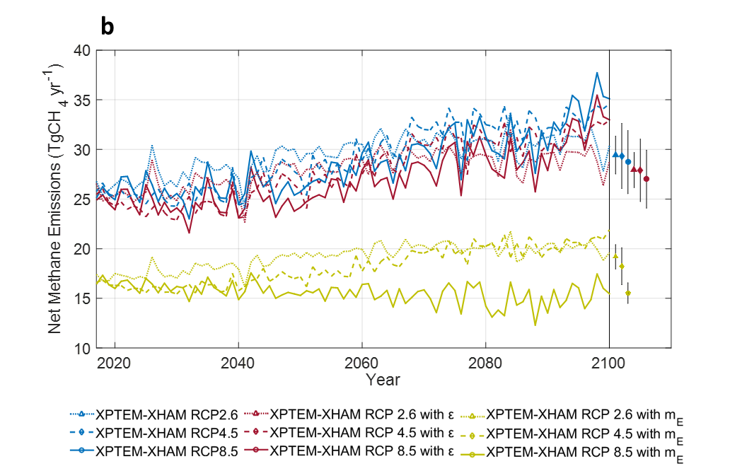 研究人員將最近在北極礦物土壤中發(fā)現(xiàn)的高親和力甲烷氧化菌(HAMs;甲烷氧化細(xì)菌)和產(chǎn)甲烷菌的動(dòng)力學(xué)整合到包含永凍層土壤有機(jī)碳動(dòng)力學(xué)的生物地球化學(xué)模型中。新模型預(yù)測(cè),由于永凍層中的有機(jī)碳在較暖和的氣候下會(huì)更容易被微生物降解,在2017年至2100年之間濕地甲烷排放量將增加一倍。但是,高地凍土由HAMs主導(dǎo)的甲烷匯強(qiáng)度同時(shí)也在增加,因而抵消了大部分濕地甲烷的排放,令北極地區(qū)甲烷凈排放量?jī)H增加18%。預(yù)計(jì)由于HAMs和產(chǎn)甲烷菌對(duì)溫度上升所作出的生理反應(yīng)有異,北極地區(qū)甲烷凈排放量可能會(huì)進(jìn)一步降低。