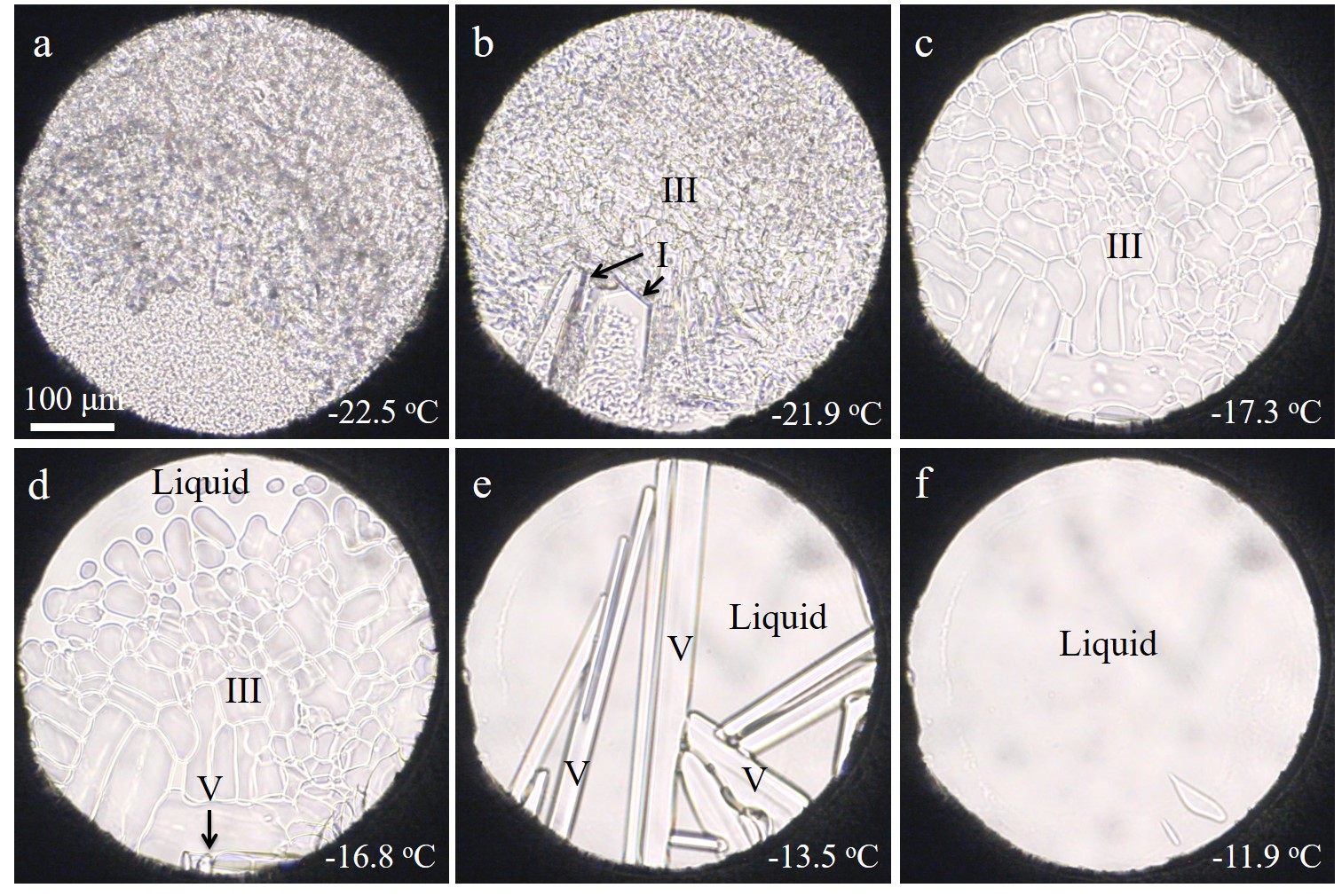 在論文中,研究人員設計了一種新型熱液金剛石壓腔(HDAC-VII)及其配套冷卻系統。相對于之前類型的壓腔,HDAC-VII具有更小的體積,方便開展激光拉曼、X射線吸收光譜和熒光光譜等原位分析,解決了冷卻實驗中窗口結霜等問題。其配套的冷卻系統可以使樣品腔冷卻到-170oC,測溫準確度為±0.5oC,最低冷卻速率為0.1oC/min。研究者應用HDAC-VII壓腔及冷卻系統,原位觀測到了I、III和V號冰融化過程(如圖),及開展了鋰云母的結晶實驗研究,證明了實驗系統的穩定性和有效性。該類型壓腔的研發,擴大了HDAC的應用范圍,使之具備開展精細冷凍實驗的能力,方便測定不同流體體系的熱力學參數,以較大地促進地質流體科學的發展。