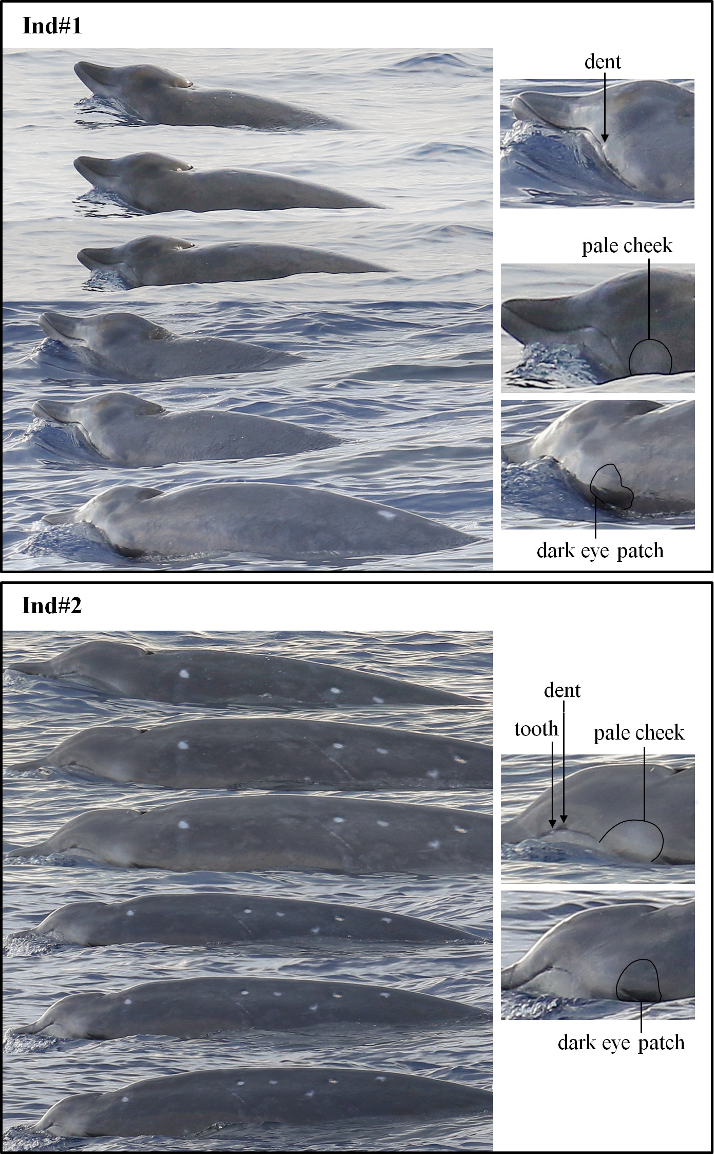中科院深海所研究團隊在南海目擊到的三頭喙鯨體型相似,視覺上估計體長有4.5至5米。其中兩頭被拍攝到高清質量照片,分別記為ind#1和ind#2。中等大小的鐮狀背鰭位于體長約三分之二處(見圖1);體表背部呈灰褐色;上顎呈褐色沒有白邊;下顎和臉頰呈蒼白色;有輕微的黑眼斑;上嘴唇拱形張口后有小凹痕;ind#2有突出的牙齒(見圖2)。兩頭動物體表都有達摩鯊咬痕,愈合的達摩鯊咬痕很少有白色愈合疤痕,大多數愈合疤痕與周圍皮膚的顏色相同(見圖3)。三頭喙鯨同步進行了三次連續潛水(淺潛),第四次為深潛,然后消失。呼吸頻率約為每分鐘10次。此外沒有觀察到其它水面行為。