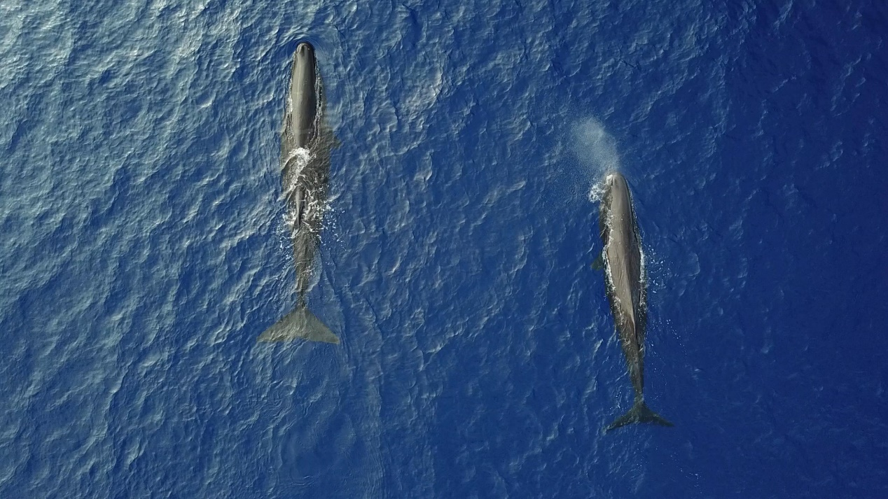 值得一提的是,科考隊員們曾多次觀察到抹香鯨和其它鯨類(弗氏海豚)混游的奇特現(xiàn)象。在蔚藍的海面上,幾頭海洋巨獸抹香鯨(體長十幾米,體重幾十噸)被數(shù)十頭小迷弟弗氏海豚(2至3米長,體重僅幾百公斤)所環(huán)繞追隨,抹香鯨高達數(shù)米的噴氣柱與弗氏海豚快速游動激起的浪花形成強烈的視覺反差。這種奇妙的場景立馬引發(fā)了科考隊員的熱烈討論,有人認(rèn)為“蹭吃假說”可以解釋這種現(xiàn)象,因為弗氏海豚跟著抹香鯨有可能不勞而獲,撿吃漏網(wǎng)之魚,畢竟抹香鯨食量驚人,飽餐之后所剩殘羹也夠一群海豚大快朵頤。也有人認(rèn)為這種混游現(xiàn)象是弗氏海豚的一種社會寄生、尋求庇護的行為,即弗氏海豚對抹香鯨有某種“小弟崇拜大哥”的依附感,通過追隨抹香鯨以獲得庇護、躲避天敵。接下來,科研人員將對相關(guān)科考數(shù)據(jù)進行分析,開展社會行為學(xué)研究,對解釋鯨豚混游現(xiàn)象的不同猜想進行驗證。