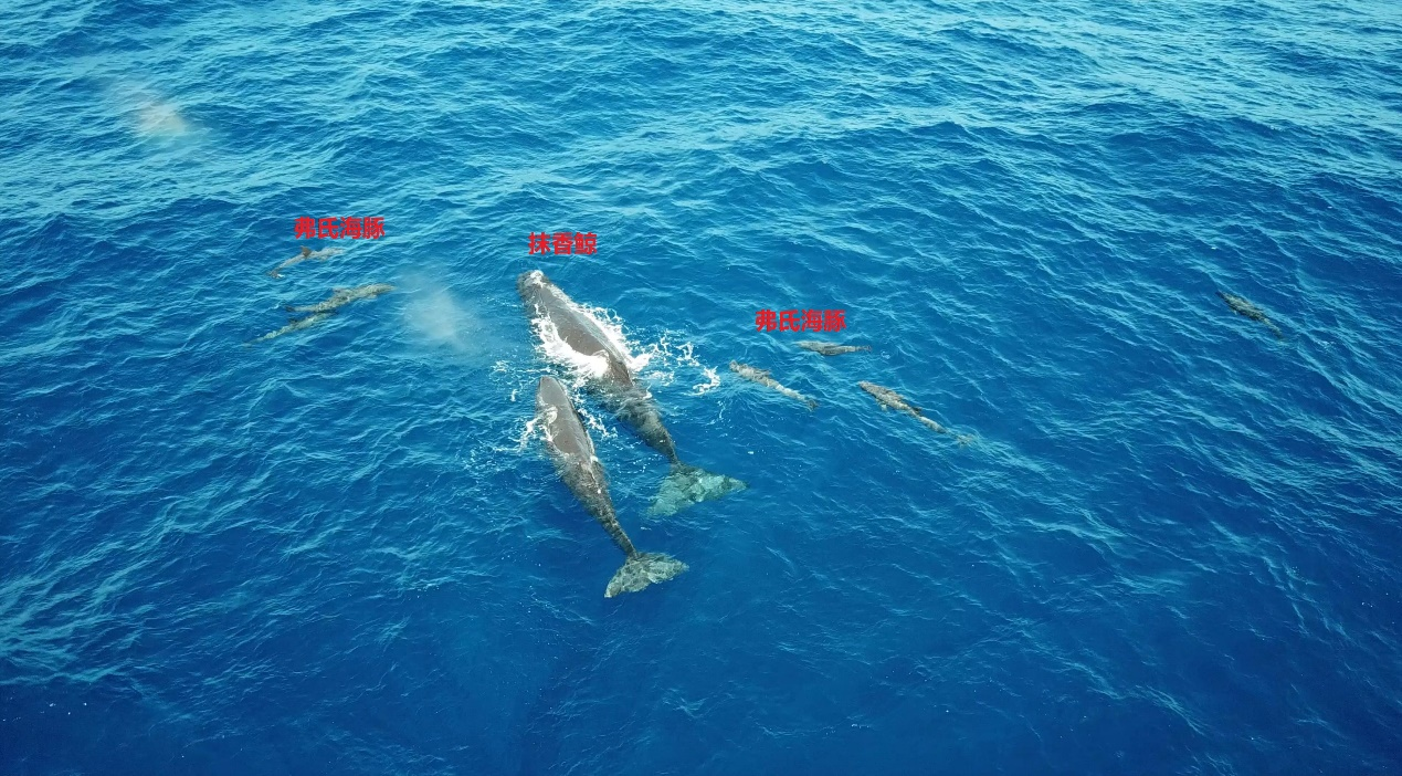 圖9. 南海抹香鯨與弗氏海豚形成的“鯨豚混游”現(xiàn)象(圖片來源:深海所研究團隊;拍攝者:劉明明)