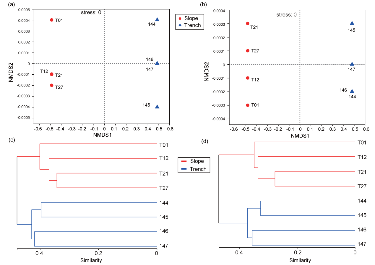 研究結(jié)果顯示,沖繩海槽比馬里亞納海溝具有更多的真核生物類群,而且兩個(gè)深海區(qū)域的底棲生物類群的組成是截然不同的。對28S rRNA 基因序列,在OTU水平上,僅有7% 的OTUs(Operational taxonomic units)是兩個(gè)區(qū)域共有的,而即使在科的水平上,兩個(gè)區(qū)域之間共有的科也僅占到20%左右。18S rRNA 基因也具有相似的趨勢。NMDS和聚類分析也顯示兩者間的群落組成是顯著不同的(p < 0.05)。