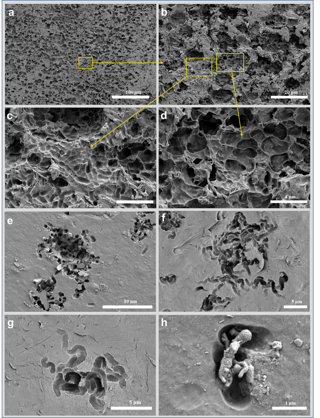 有趣的是,在18片PE表面還發(fā)現(xiàn)了大量與桿狀微生物的形態(tài)相一致的溶蝕坑結(jié)構(gòu)(圖2),所有凹坑的長度均為1-2μm。如圖2a-d所示,該塑料表面有大片相互連接的蝕坑,主要包括短棒狀和花生狀兩種結(jié)構(gòu),呈現(xiàn)高度降解。此外,在其他樣品表面還觀察到不同形態(tài)的蝕坑,例如蠕蟲狀和絲狀結(jié)構(gòu)(圖2e-g)。