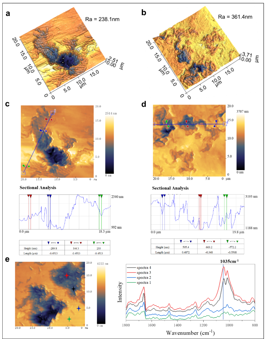 通過光誘導(dǎo)力顯微鏡(PiFM)再現(xiàn)了典型蠕蟲狀結(jié)構(gòu)的三維形態(tài)學(xué)(圖3a,b)。Ra(粗糙度平均值)通常用于指示表面粗糙度。很明顯,降解程度越高的塑料表現(xiàn)出較高的粗糙度。與掃描電鏡(SEM)相比, PiFM在垂直方向上具有更高的準(zhǔn)確度和精密度,可用于探測凹坑的深度。如圖3所示,在相對早期的降解階段,蠕蟲狀凹坑的寬度約為0.9μm(0.45×2μm),深度約為144.3-289.8nm。隨著降解的發(fā)展,坑深度變大,約為572.2-663.2 nm。