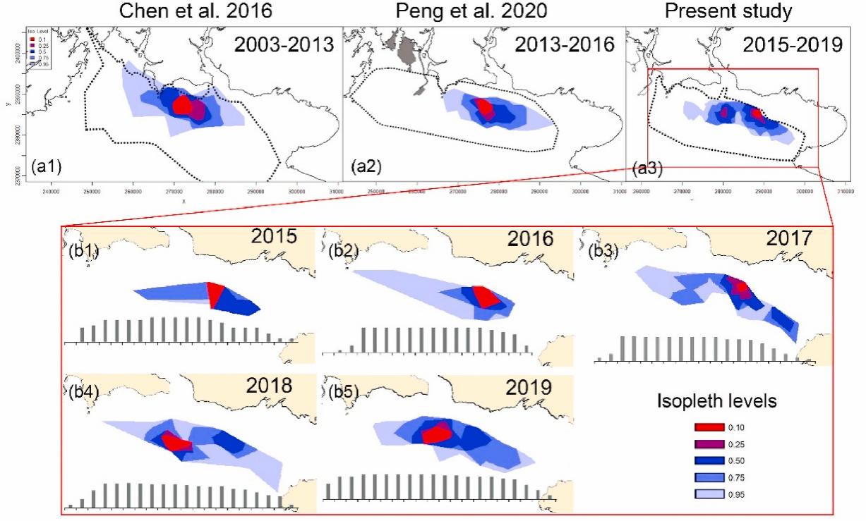 2022年12月20日,中科院深海所海洋哺乳動物研究團(tuán)隊與汕頭大學(xué)研究團(tuán)隊合作,在國際學(xué)術(shù)期刊Journal of Environmental Management發(fā)表題為《Ranging pattern development of a declining delphinid population: A potential cascade effect of vessel activities》的研究文章。該研究提取了北京大學(xué)、北部灣大學(xué)、廣西省科學(xué)院等團(tuán)隊在北部灣大風(fēng)江口水域(下稱該水域)的已發(fā)表目擊數(shù)據(jù),并整合了深海所與汕頭大學(xué)2015年至2019年間系統(tǒng)調(diào)查結(jié)果,分析該海域中華白海豚空間分布的長期變化。研究結(jié)果顯示,該水域中華白海豚的活動范圍在本世紀(jì)初顯著減少。盡管海豚的整體活動范圍在近十年內(nèi)較為穩(wěn)定地集中在三娘灣至廉江灣一帶海域,但海豚的核心棲息地存在明顯的偏移。與早期空間分布模式相比,該海域的海豚核心棲息地在2015-2017年間從三娘灣沿岸東移至廉江灣外圍海域,而又在2018-2019年稍回落至三娘灣一側(cè)。