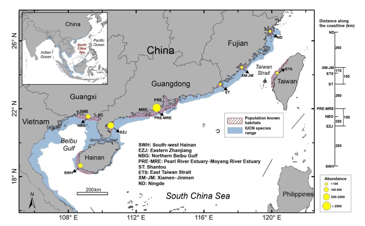 1 我國中華白海豚的棲息分布情況,藍(lán)色區(qū)域為IUCN紅色名錄提供的物種分布范圍,紅色區(qū)域為實地調(diào)查確定的棲息地,黃色圓圈顯示了種群規(guī)模,右側(cè)數(shù)字為連接相鄰種群的最近海上距離