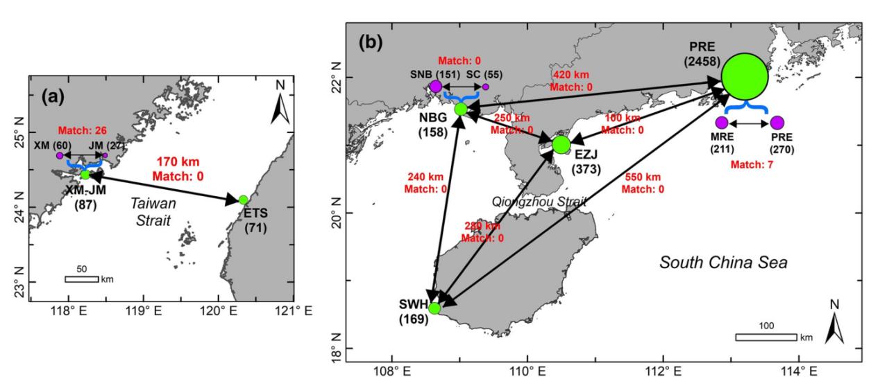2 不同中華白海豚種群/亞種群的照片識別交叉比對結(jié)果示意圖:(a)廈門-金門和臺灣西海岸種群;(b) 海南西南部、湛江東部、北部灣和珠江口-漠陽江口種群。括號中的數(shù)字表示各區(qū)域已識別個體數(shù)量