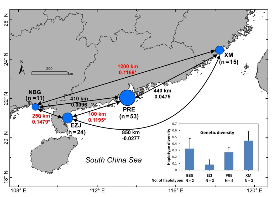 圖3 北部灣、湛江東部、珠江口和廈門中華白海豚種群分化和遺傳多樣性示意圖。括號中的數(shù)字表示各區(qū)域采集樣本數(shù)量