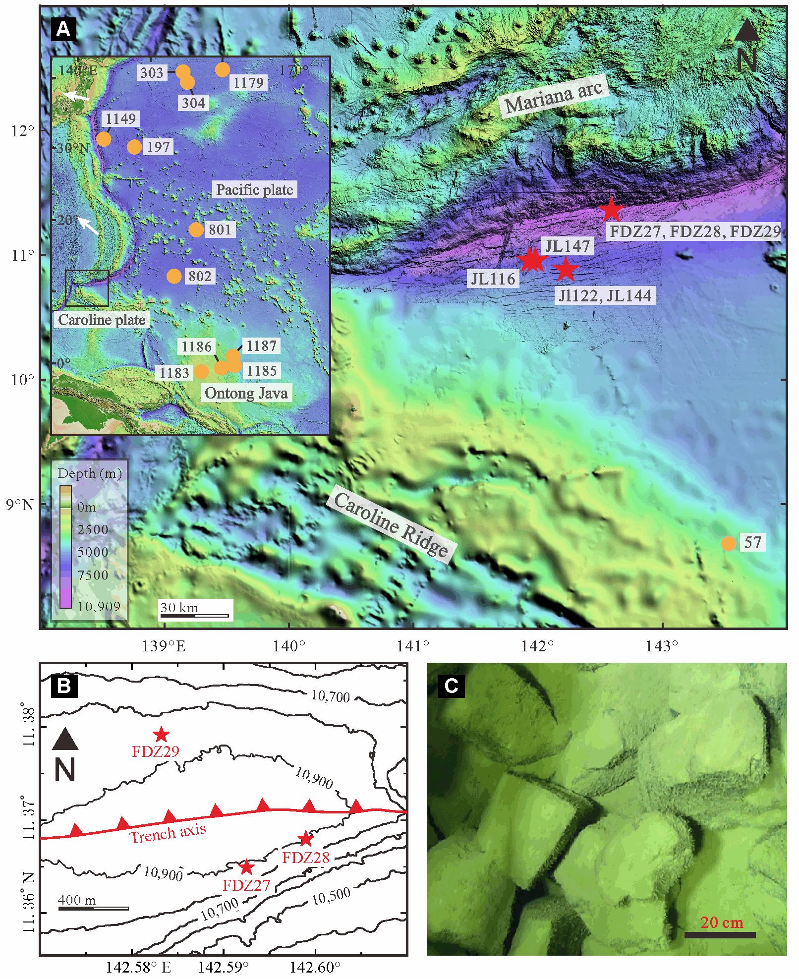 Xu, W.J., Peng, X.T., Stern, R.J., Xu, X.S., Xu, H.C., 2023. Challenger Deep basalts reveal Indian-type Early Cretaceous oceanic crust subducting in the southernmost Mariana Trench. Geology, https://doi.org/10.1130/G51258.1.