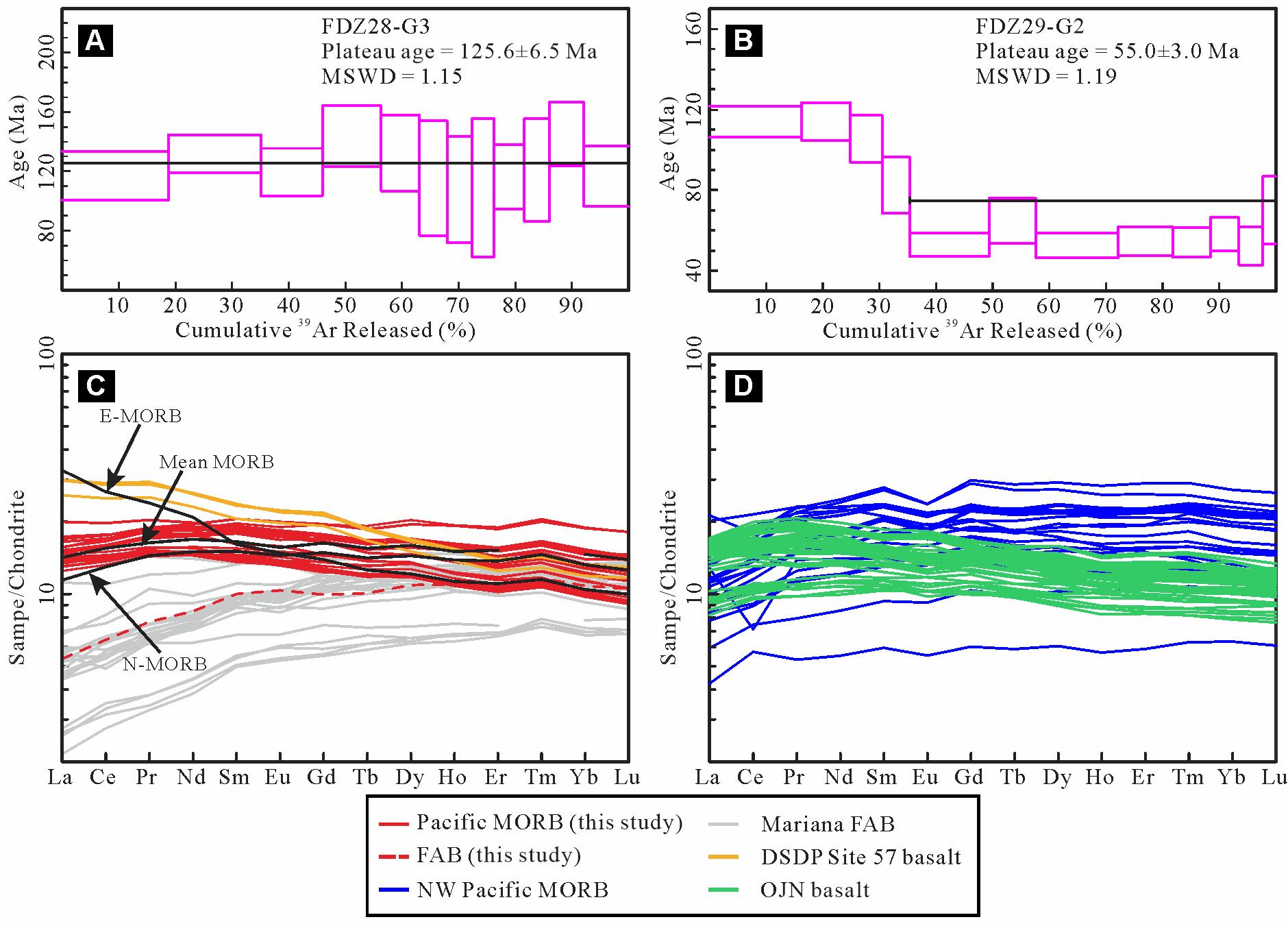 2. 樣品年齡及REE配分模式。西北太平洋洋中脊玄武巖(Pacific MORB)、馬里亞納弧前玄武巖(Mariana FAB)、翁通爪哇高原玄武巖(OJN basalt)和卡羅琳板塊玄武巖(DSDP Site 57 basalt)等引用數據來自于GEOROC數據庫,同圖3。