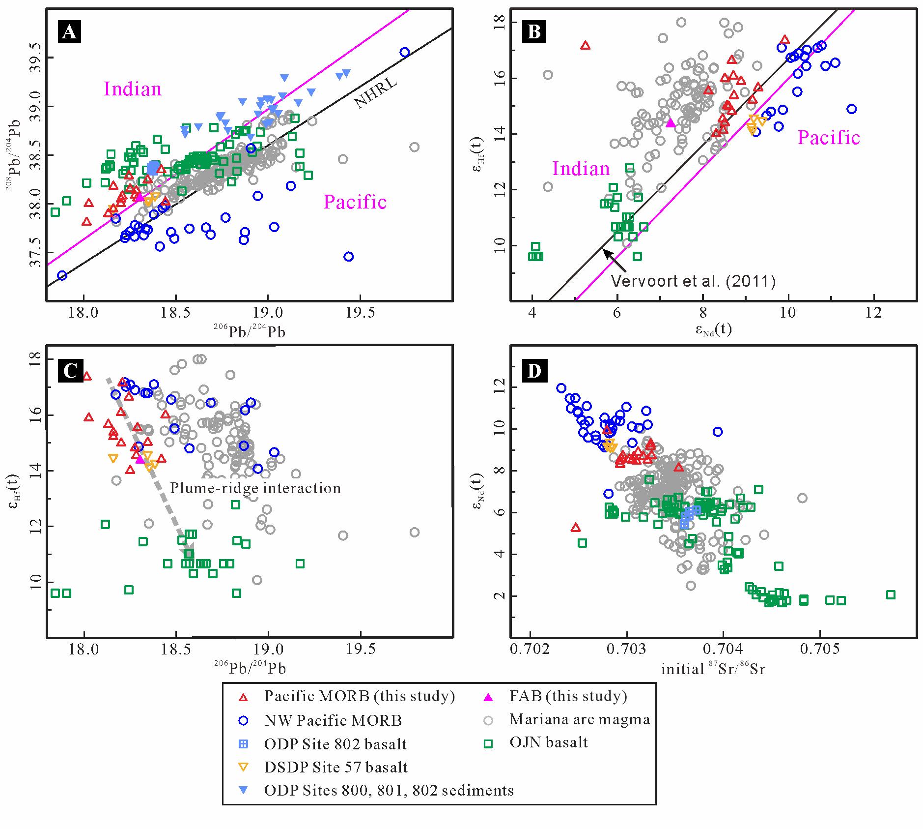 此項研究有以下3個方面的重要認識:(1)早白堊世太平洋MORB發育印度洋型地幔域同位素特征。研究樣品具有與其他西北太平洋MORB相似的微量元素和Hf同位素組成,但略微富集不相容元素,具有略微富集的Sr–Nd–Pb同位素組成,表現出印度洋型地幔域同位素特征——這些特征可能是地幔柱洋中脊相互作用的產物。(2)馬里亞納海溝俯沖大洋板片在弧巖漿成分多樣性形成過程中起著關鍵作用。本研究明確了具有印度洋型地幔域同位素特征的早白堊世太平洋MORB是馬里亞納弧巖漿Pb元素組成的重要端元之一。(3)馬里亞納海溝最南部俯沖起始時間可能在55Ma。來自挑戰者深淵北部的一件弧前玄武巖(FAB)樣品給出40Ar/39Ar年齡為55.0 ±3.0 Ma——IBM初始俯沖時間在誤差范圍內一致,考慮到以往研究樣品采集深度均淺于7000m深度,馬里亞納海溝最南端俯沖起始時間可能提前到55Ma。