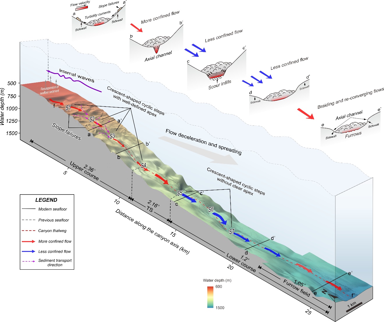 深海海底濁流的形成與演化機制一直是深海地質科學領域的研究前沿與熱點問題。該研究為峽谷底部微地貌成因及演化過程提供了新的見解,為準確評估與預測深海工程地質災害提供理論基礎。研究成果表明,細粒、低濃度的超臨界濁流形成了沿海底峽谷中泓線分布的新月型周期階坎(圖二)。