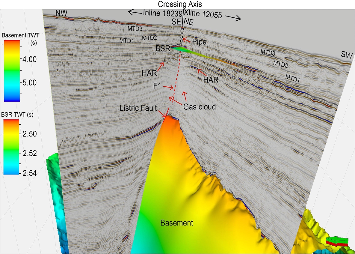 針對上述問題,該研究以瓊東南盆地松南低凸起上發育的活躍冷泉為研究目標,基于三維地震和測井數據,發現支撐海底冷泉活動的流體系統由上下兩部分組成。研究區內水合物穩定帶之下發育3個大型氣云構造(Gas cloud),在內部發育斷層。在氣云之上的水合物穩定帶內發現28個流體管道(Pipe)穿透3套垂向堆疊的滑坡沉積體到達海底。研究認為氣云構造內的斷層和流體管道垂向相連,共同組成支撐冷泉活動的海底流體活動系統。
