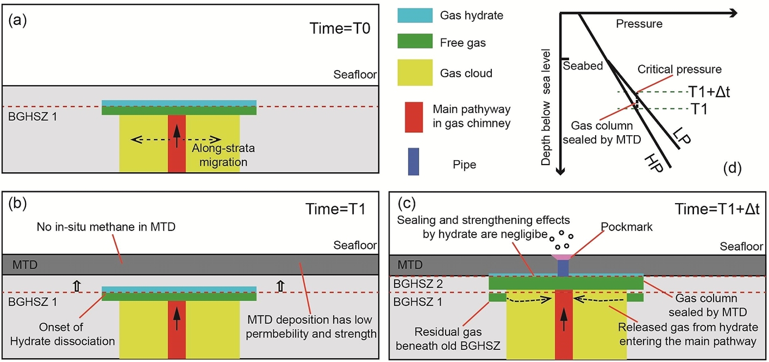 該研究表明水合物穩定帶內低滲透性滑坡沉積而非含水合物地層封存了下伏游離氣。連續在海底發生的3期滑坡導致水合物穩定帶快速向上遷移,原穩定帶底界附近水合物分解,而新底界之上短時間內不能生成大量水合物形成有效封存。游離氣進入水合物穩定帶并向上運移,在低滲透性滑坡沉積底部聚集,形成超壓,達到臨界值發生水利壓裂,形成流體管道,甲烷發生滲漏。多期滑坡存在表明該過程重復發生,可能導致冷泉間歇性活動。該研究表明滑坡對海底冷泉活動具有控制作用,低滲透性滑坡沉積如同閥門,管理海底冷泉甲烷釋放。