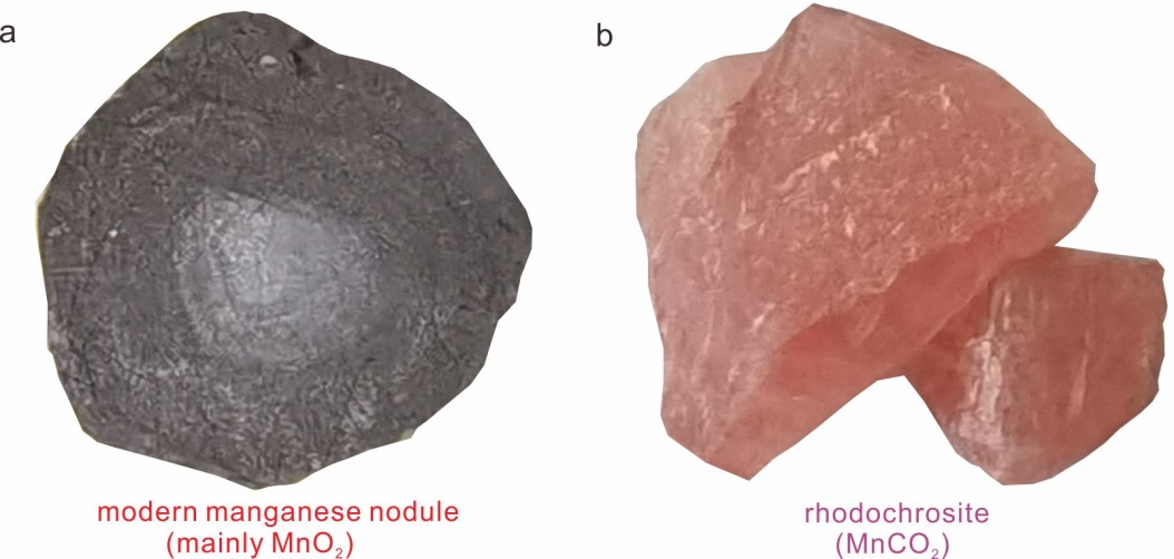 圖1. 現(xiàn)代錳結(jié)核手標(biāo)本橫切面(圖a)和菱錳礦晶體(圖b)