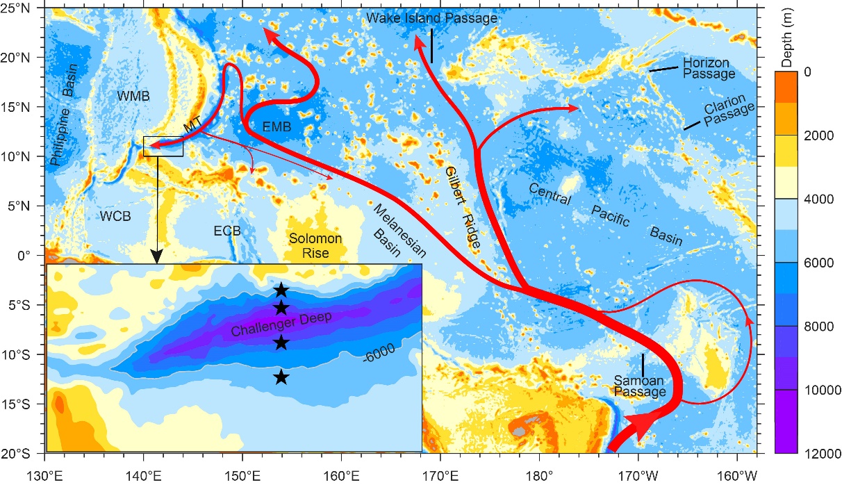 圖1. “挑戰(zhàn)者”深淵位置和潛標站位置、以及西太平洋深層環(huán)流示意圖