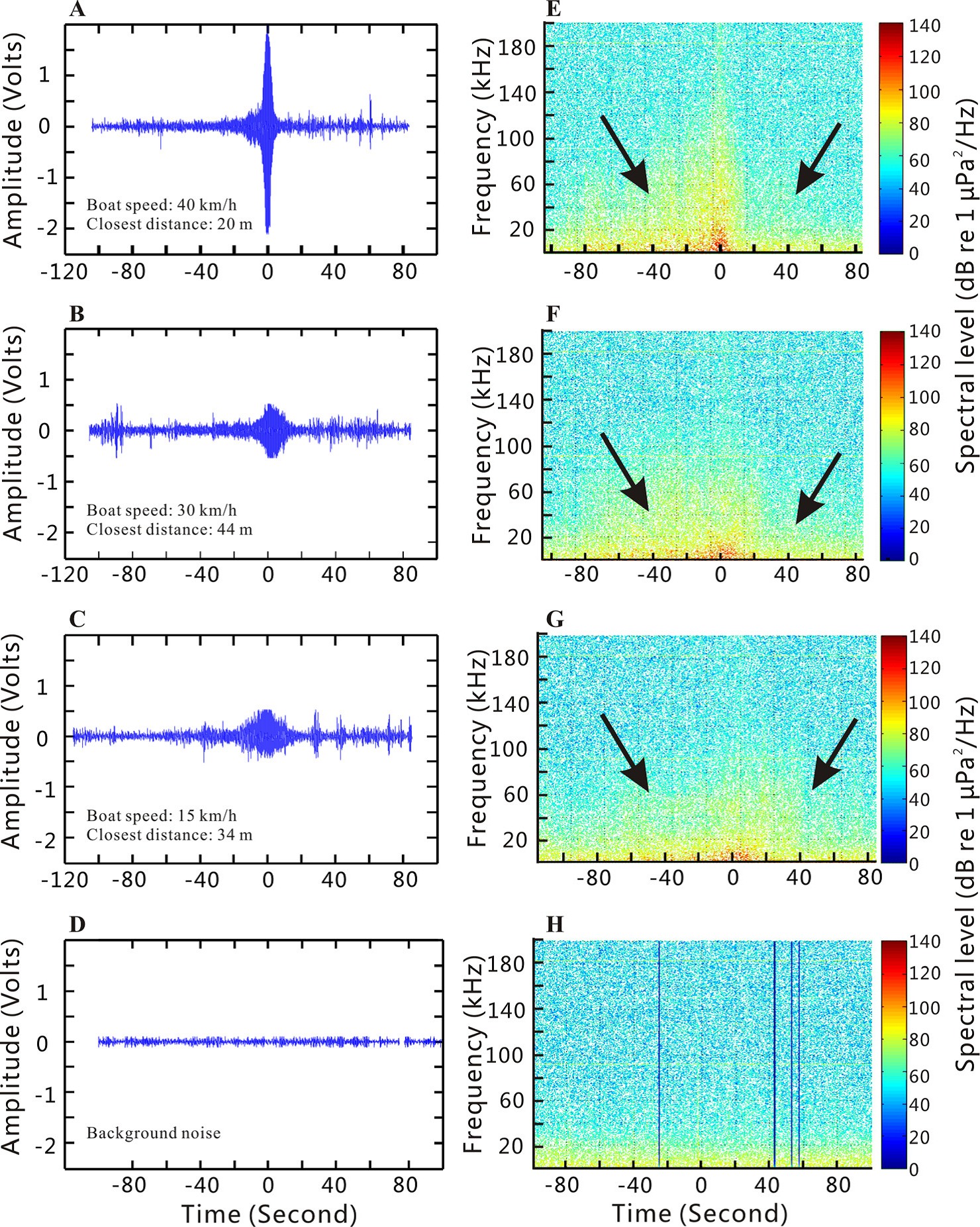 最后作者根據研究結果對海豚保護提出相應的保護措施,在中華白海豚出沒海域應盡量限制高速快艇的活動;如沒法禁止,在中華白海豚800-1000 m范圍內,小型高速快艇的航速應該控制在30 km/h之內;在500-600 m范圍內,小型高速快艇的航速應該控制在15 km/h之內;在250 m范圍內,小型高速快艇的發動機應該完全關閉。同時建議其他人員在評估人造噪聲對海洋哺乳動物所產生的潛在影響時,應盡可能采用寬頻聲信號記錄和分析系統,研究和分析10 Hz-200 kHz的寬頻海洋噪聲特征而不是像以往的絕大多數研究僅分析10 kHz以下的噪聲特征。