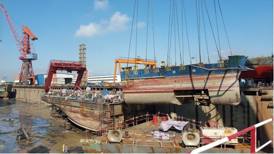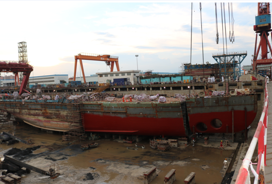 在探索一號船改工作組、監理組和船廠的多方溝通配合下,項目組制定了船舶進塢、測量、切割、搭載等一系列計劃,并有序開展船舶進塢搭載前的準備工作。9月3日,船舶順利進塢,在完成干塢等工作后,于晚上22時許,對船舶主尺度和船底擾度與基線進行了測量。4日上午,舊船體完成切割和掛鉤,并用浮吊將割除的舊船體吊離。下午,主船體兩個新分段先后吊裝到位,探索一號船體初具形態。未來一周,將對船舶新分段進行測量和定位,最終完成船體焊接工作。