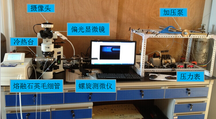 該實驗室利用已具備的技術條件,通過購買實驗平臺所需的設備和材料自行搭建組裝,于2014年9月,在周義明研究員的指導下完成了深淵水體、熱液及冷泉環(huán)境模擬實驗平臺的搭建,目前已投入使用。在現有設備條件下,計劃開展不同地質流體的飽和蒸汽壓觀測實驗。在毛細管內運用汞封技術制備封閉待測樣品,并與控溫、加壓系統(tǒng)相連接,在體視鏡下實現對不同地質流體飽和蒸汽壓的觀測。